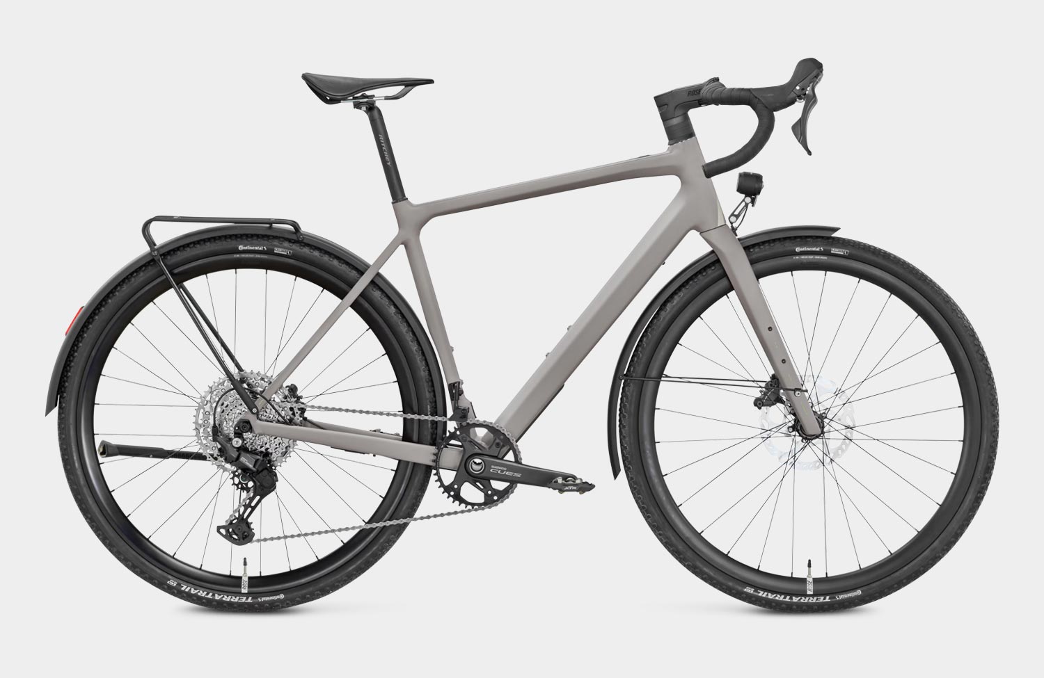 Ritchey’s drop bar handlebars are 42 cm wide and are designed to allow for as many comfortable hand positions as possible. They also feature an ergonomic aero tube profile in the upper handlebar area, which ensures balanced pressure distribution thanks to the larger contact surface. The tyres are from Continental, with 40 mm wide Terra Trail, which are perfectly matched to the dimensions of the aluminium mudguards. A rear rack, kickstand, lighting system with Litemove headlight and the Trelock Cob Line rear light with brake light function round off the everyday equipment.