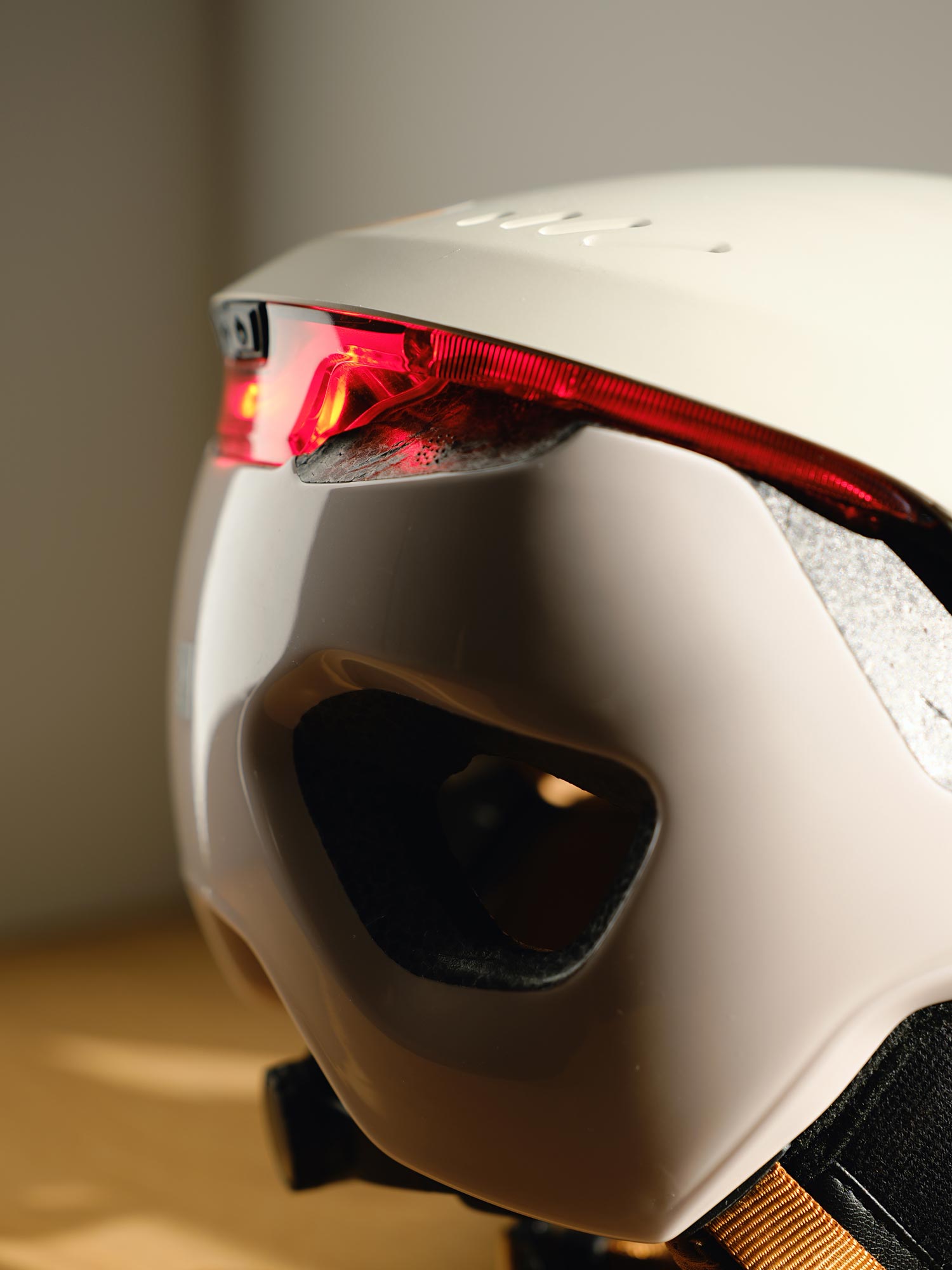 The wide LED light strip is one of the biggest advantages of this helmet. It is highly visible not only from behind but also from the side, which leads to a noticeable increase in safety in road traffic. The lighting is controlled by a button on the back, which first activates continuous light and then flashing light. The pressure point is well chosen, so that it can be operated easily even when wearing gloves. However, due to the position of the switch, it is advisable to switch on the light before putting on the helmet.